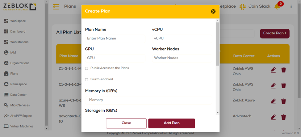 Data Center => Dropdown list of datacenters available in the Ai-MicroCloud where the resources can be allotted by this plan.