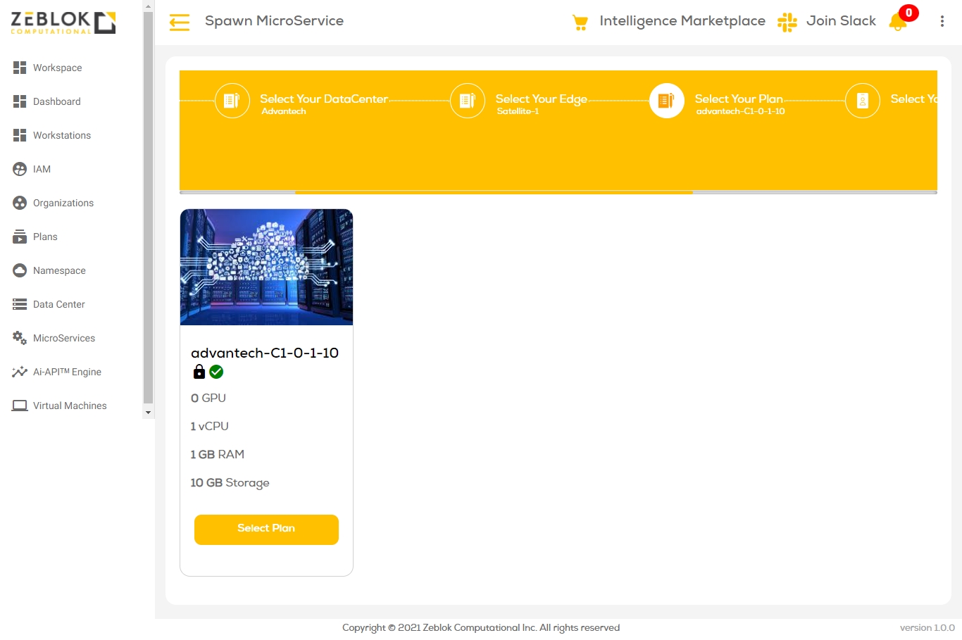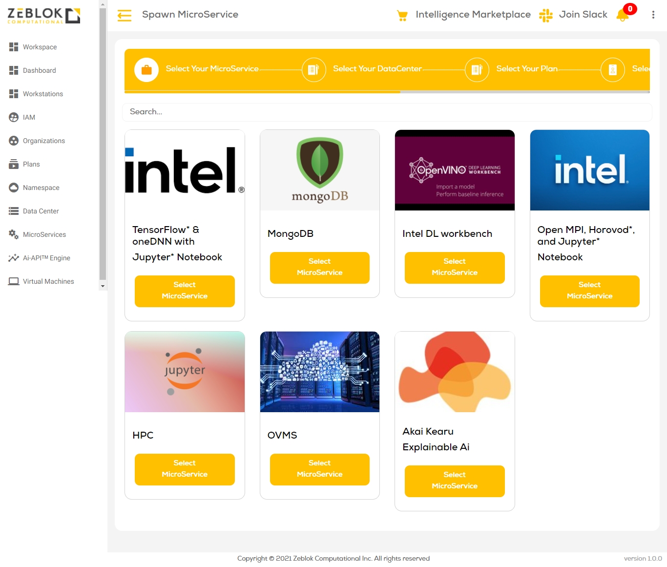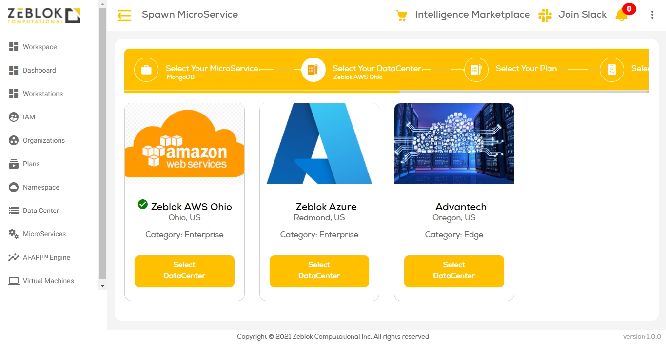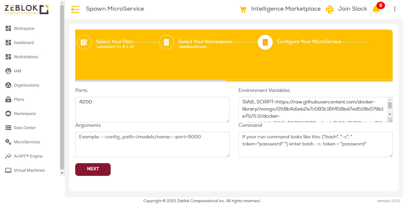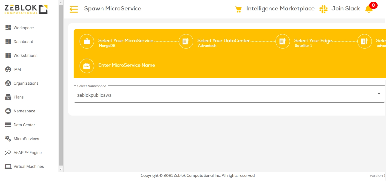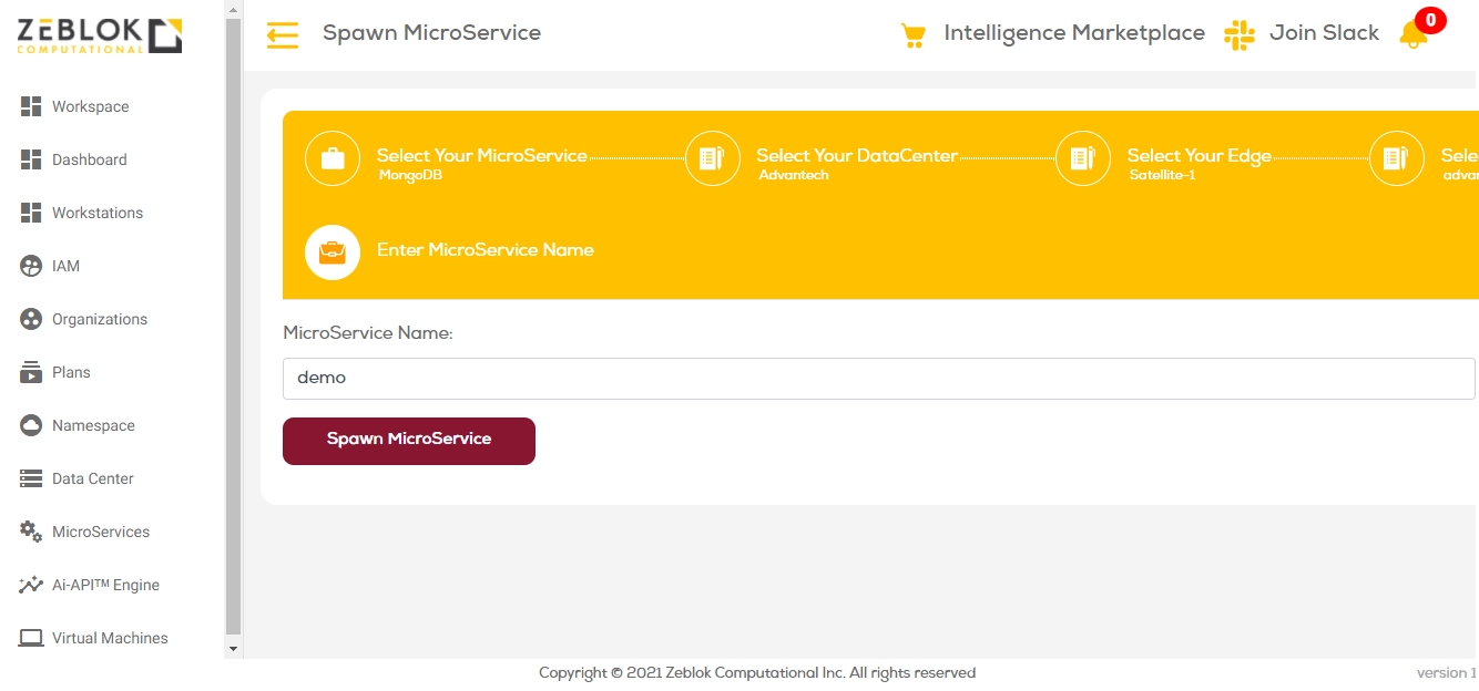 Once you logged into the Zeblok Computational Application, you will get an option for Spawn MicroService as shown in the screenshot below.