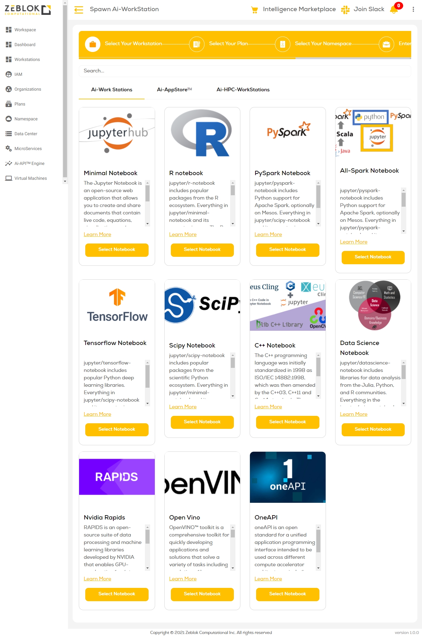 Select the Notebook which you want to use, whether it can be an Ai-WorkStations, Intelligence Marketplace, or Ai-HPC-WorkStations as shown below.