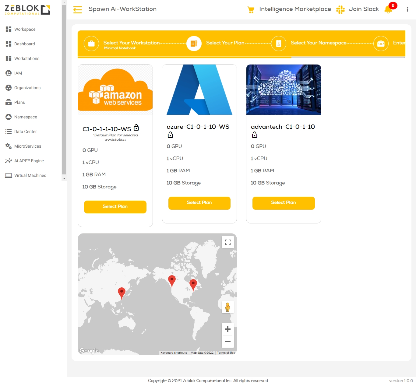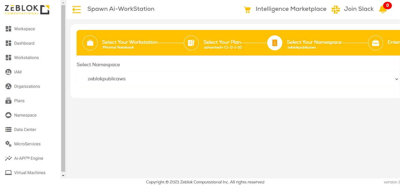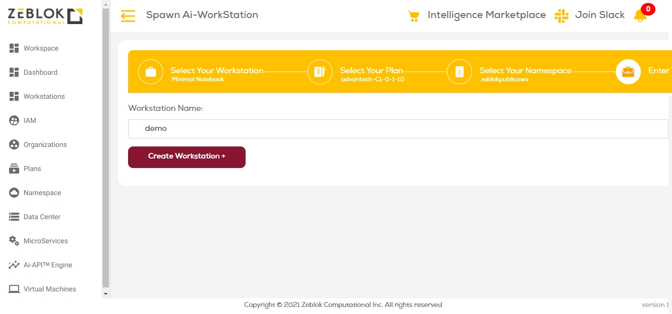Once you logged into the Zeblok Computational Application, you will get an option for Spawn Ai-Workstation as shown in the screenshot below.