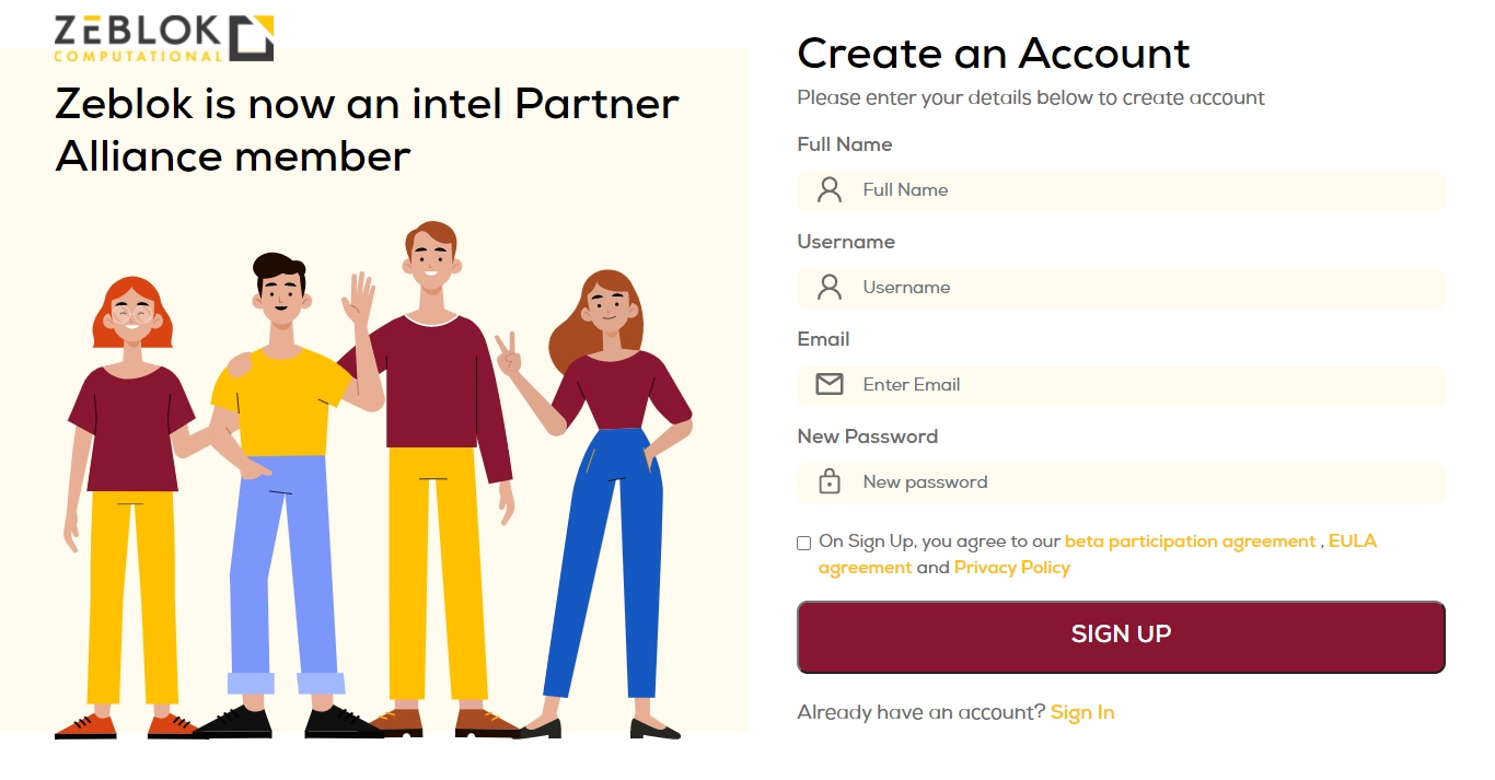 Click on this link https://app.zbl-aws.zeblok.com/signup to create an account with Zeblok Computational. You will be redirected to the Zeblok Computational Individual Signup page.