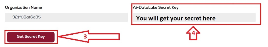 Datalake Secret: Select the Kebab menu and go to the "Manage your Zeblok Account", then Click on the "Get Secret Key" Button and you can copy the alpha-numerical key under the "Ai-DataLake Secret Key"
