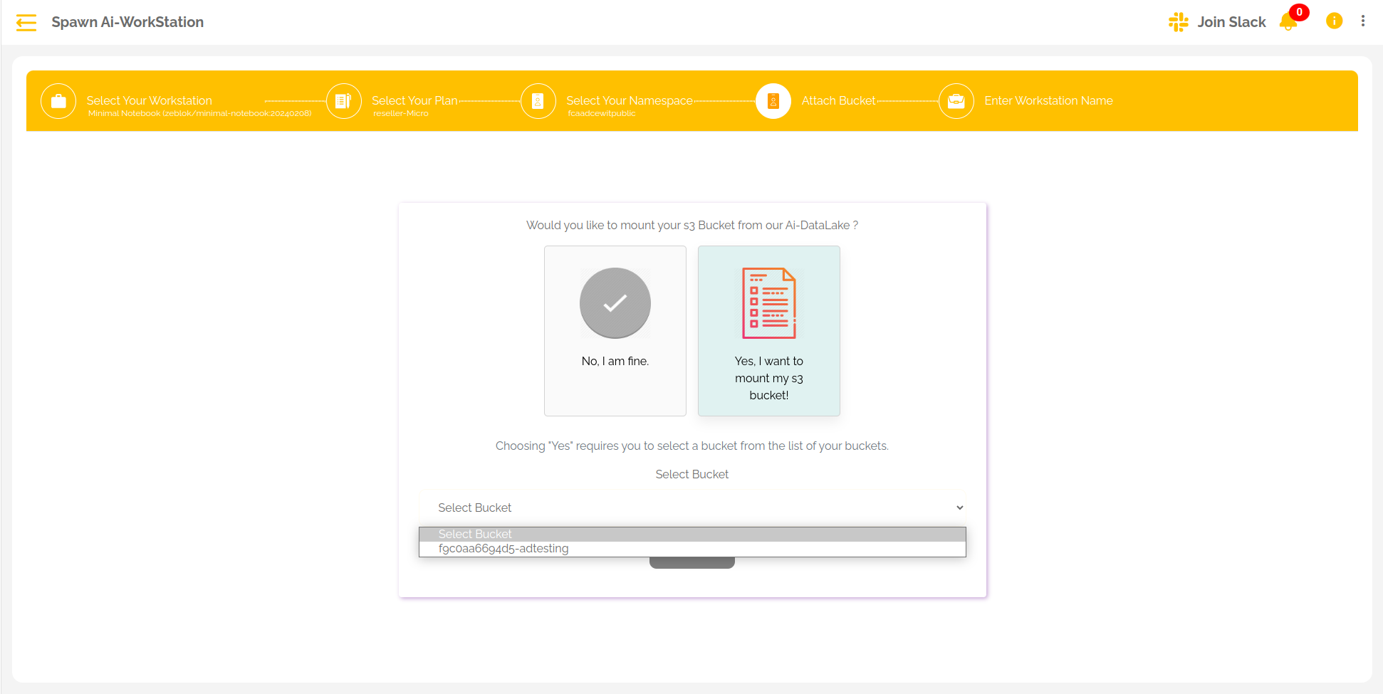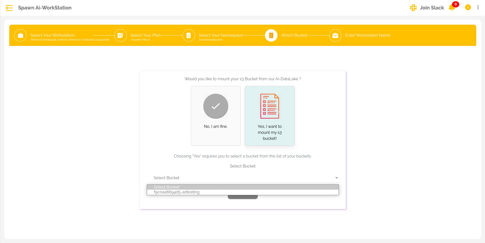 Choose whether you want to mount your S3 bucket from our Ai-DataLake or not.