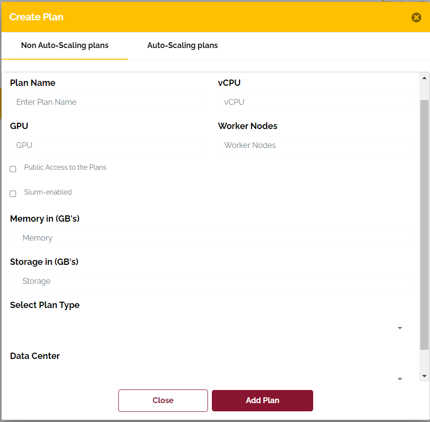 Data Center => Dropdown list of datacenters available in the Ai-MicroCloud where the resources can be allotted by this plan.